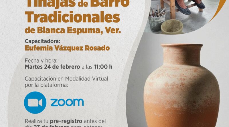 Xalapa, Ver., jueves 12 de febrero de 2026.- La Secretaría de Turismo (SECTUR) continúa con su ciclo de Capacitaciones y Experiencias Artesanales para el Fomento y Desarrollo Turístico, por lo que invita a participar en la capacitación Tinajas de barro tradicionales de Blanca Espuma, que será impartida por Eufemia Vázquez Rosado, de manera virtual, a través de la plataforma Zoom, el martes 24 de febrero, a las 11:00 horas.