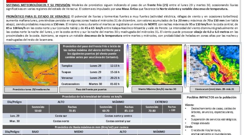 Asimismo, entre el lunes y el martes se espera un evento de Norte con rachas máximas de 95 a 110 kilómetros por hora en la costa central; de 85 a 100 kilómetros por hora en las costas norte y sur, y de 45 a 65 kilómetros por hora en la región comprendida entre Xalapa, Naolinco, Misantla y el Valle de Perote.