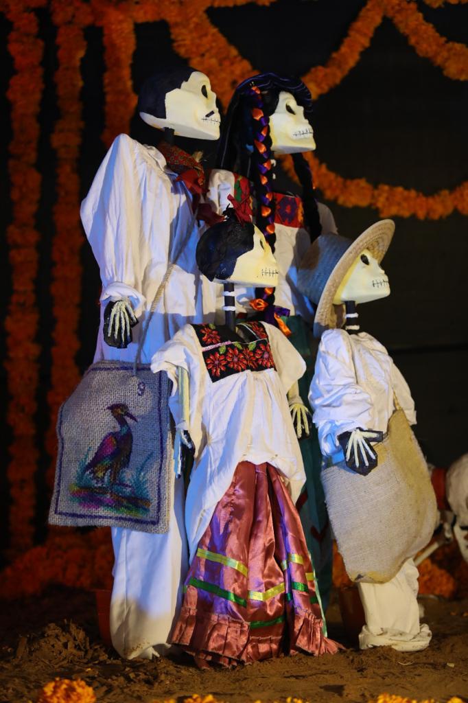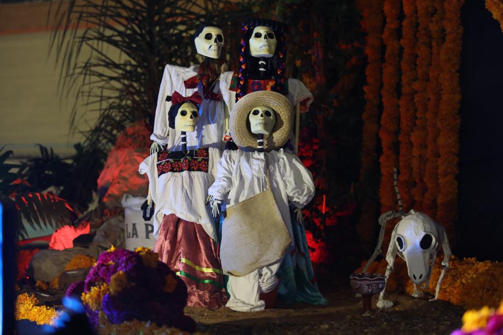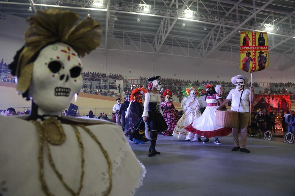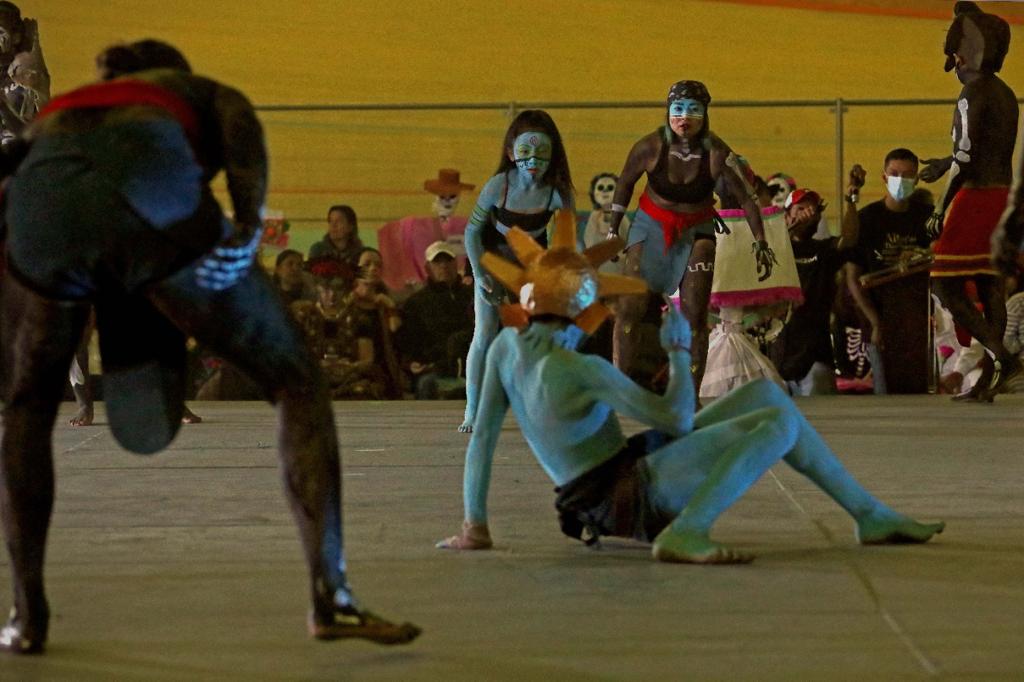 Momentos antes de la inauguración, catrinas y personajes alusivos a la festividad protagonizaron el paseo denominado Ollin (palabra nawatl que significa movimiento), desde el centro de la ciudad y hasta la sede de la exhibición monumental, integrada también por los kallis (casa en nawatl) de enseñanza de lenguas, artesanías, danzas, sabores, talleres, juegos y deportes.