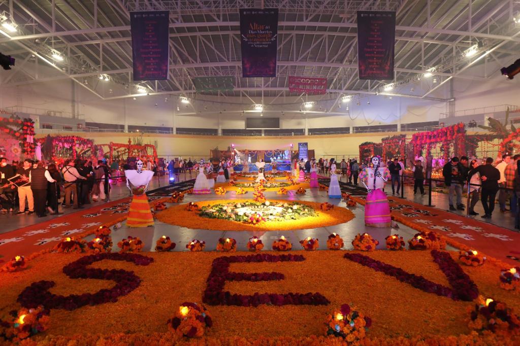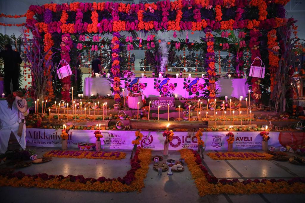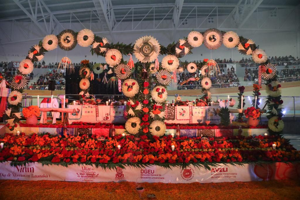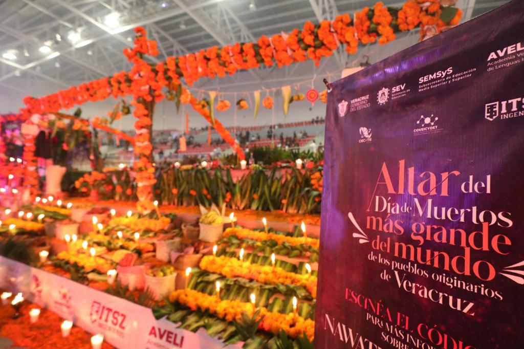 Xalapa, Ver.- Con el Altar del Día de Muertos más grande del mundo de los pueblos originarios, el Gobierno estatal, a través de la Secretaría de Educación de Veracruz (SEV), celebra la lengua y cosmovisión de 10 culturas vivas para promover con orgullo la interculturalidad entre la población que podrá conocerlo desde este domingo y hasta el 02 de noviembre, en el Velódromo de Xalapa.