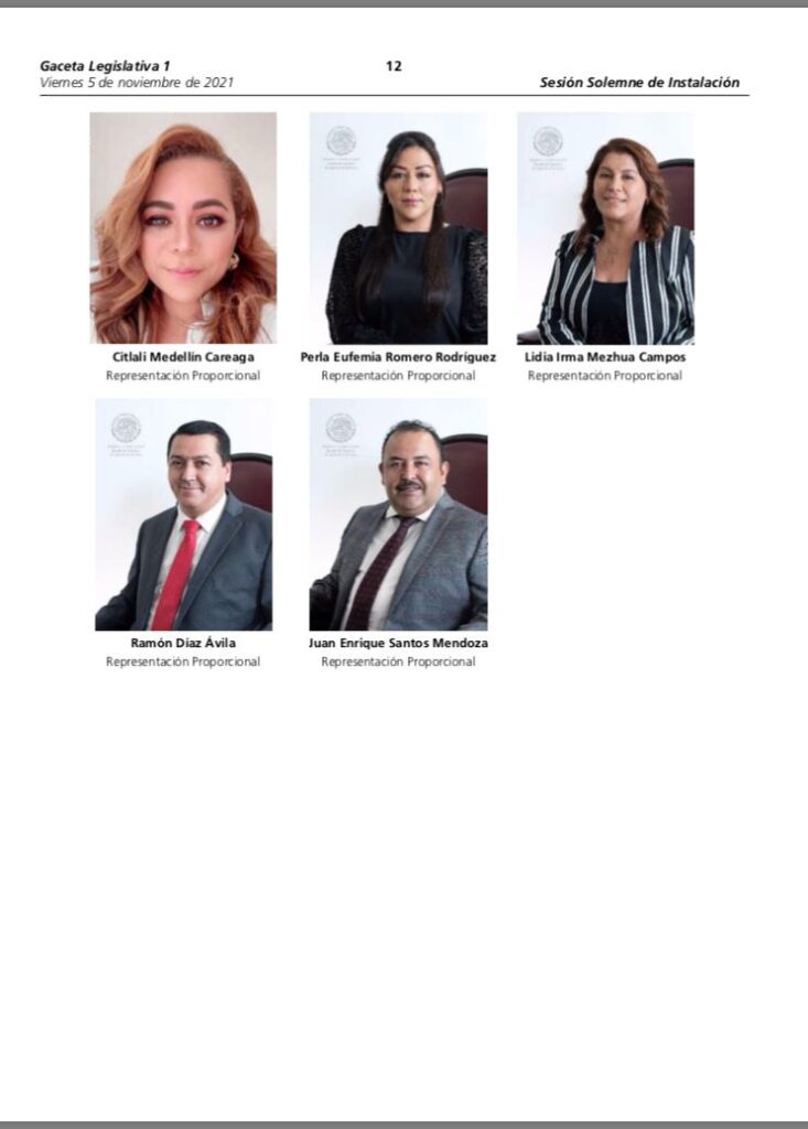 Por cuanto hace a los plurinominales; hasta el momento se trata del actual presidente de la Junta de Coordinación Política (Jucopo) Juan Javier Gómez Cazarín, el integrante no binario Gonzalo Iván Durán Chincoya y Gisela López López e Illya Dolores Escobar Martínez.
