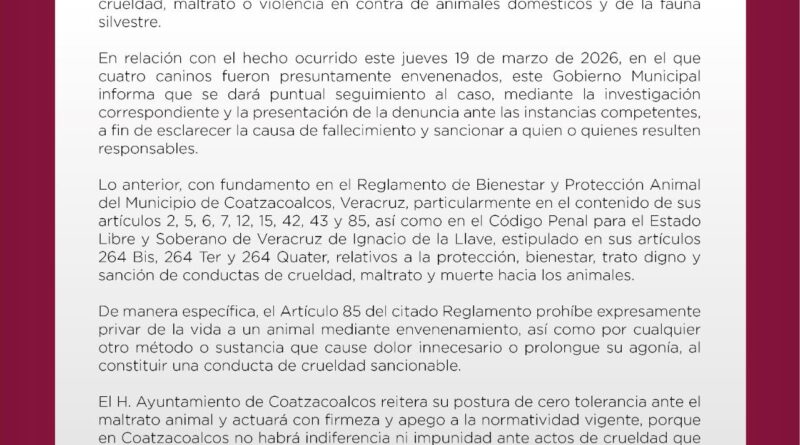 En relación con el hecho ocurrido este jueves 19 de marzo de 2026, en el que cuatro caninos fueron presuntamente envenenados, el Gobierno Municipal informa que se dará puntual seguimiento al caso, mediante la investigación correspondiente y la presentación de la denuncia ante las instancias competentes, a fin de esclarecer la causa de fallecimiento y sancionar a quien o quienes resulten responsables.
