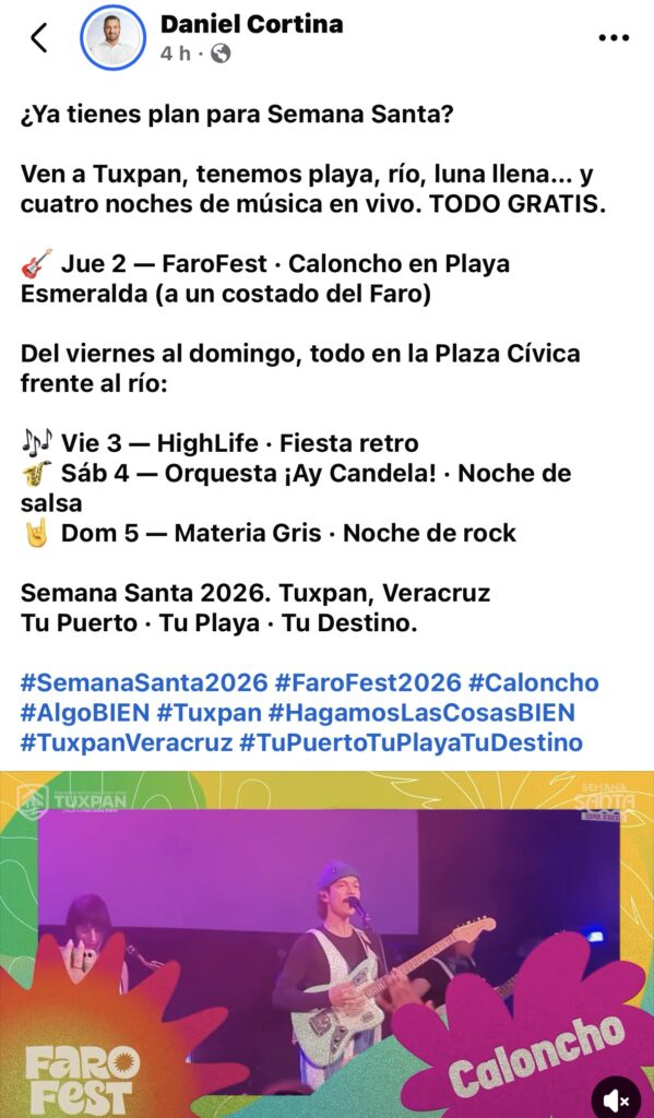 Previo a su presentación, grupos locales abrirán el escenario con el objetivo de ambientar la jornada y brindar un espacio a talentos de la zona, para que quienes visiten las playas tuxpeñas disfruten de un ambiente musical durante su estancia.