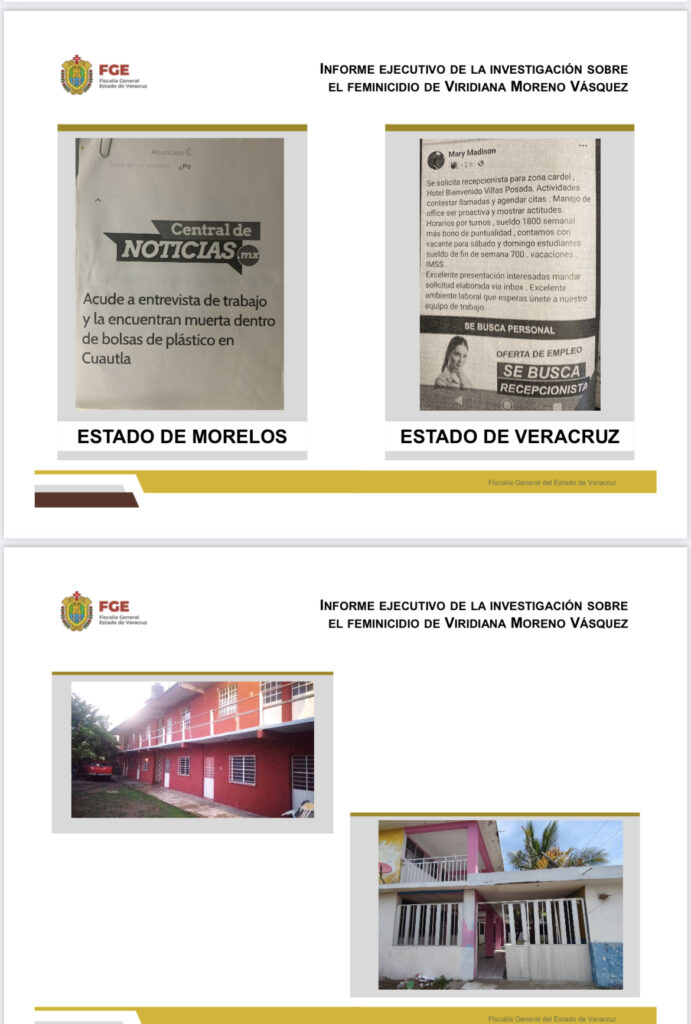 Expuso que “gracias  a tareas de investigación, fue posible determinar que el 01 de mayo de 2022, Greek “N” llegó a trabajar a la zona turística de la localidad de Chacalacas, encontrándose siempre en compañía de una femenina con la que vivía  y trabajaban en el mismo lugar, habiendo rentado dos habitaciones, estableciéndose que en la primera de ellas la habitó, mientras que en la segunda, se presume llevó a cabo el feminicidio”.
