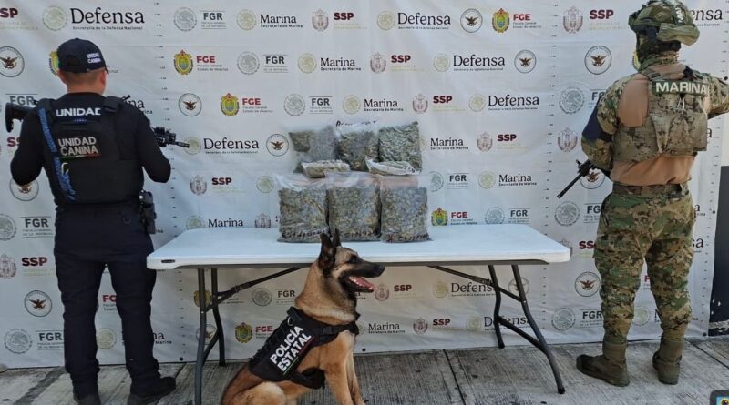 En operativos realizados en establecimientos dedicados al envió de paquetería, binomios caninos decomisaron en Poza Rica, Córdoba, Boca del Río, Veracruz y Coatzacoalcos, poco más de 10 kilogramos y 36 cigarros de hierba seca similar a la marihuana, además de 30 gramos de presunto cristal.