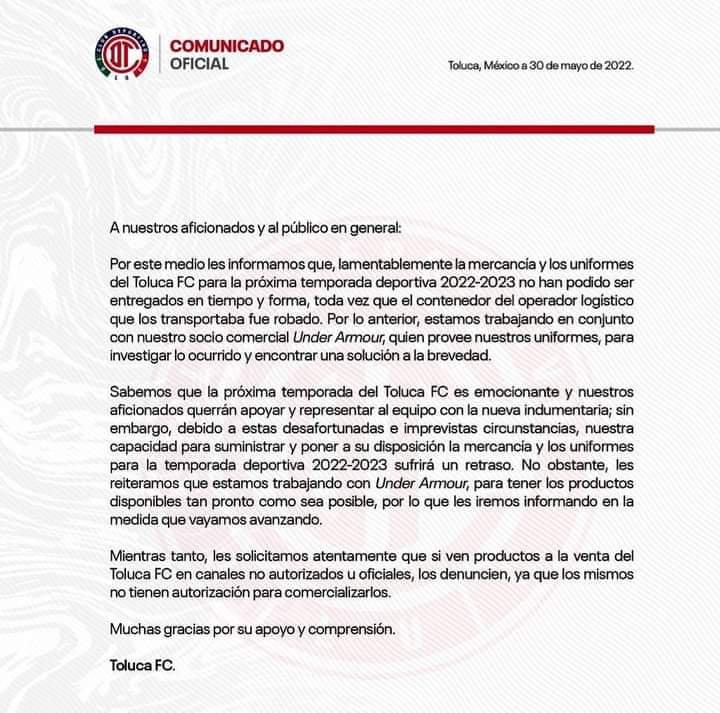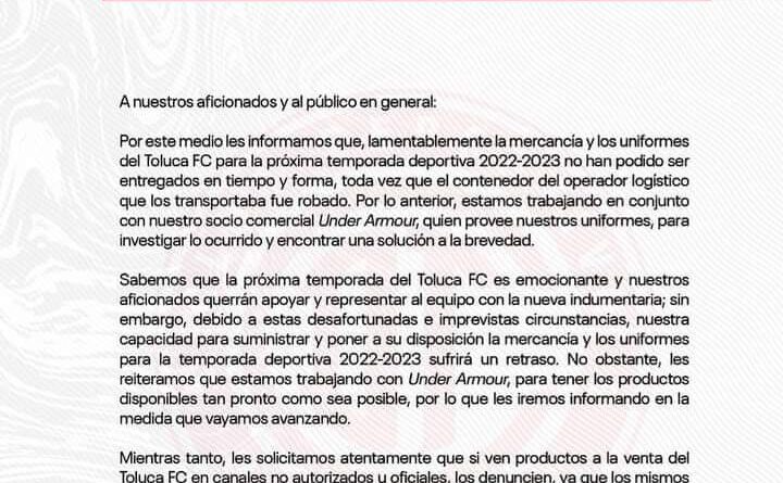 Xalapa, Ver.- De acuerdo a un comunicado, el Equipo Toluca FC denunció el robo del contenedor que llevaba los uniformes del equipo para la temporada 2022-2023, por lo que se encuentra en platicas con el proveedor Under Armour para buscar una solución.