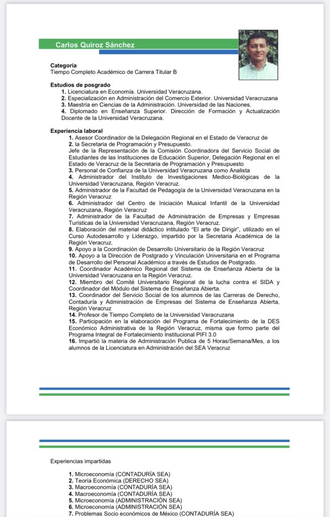 Es de hacer mención que Carlos Quiroz, también cobraba otro sueldo ya que tiene una plaza de tiempo completo académico de carrera titular B en la Universidad Veracruzana (UV) campus Veracruz, esto según el portal de la Máxima Casa de Estudios.