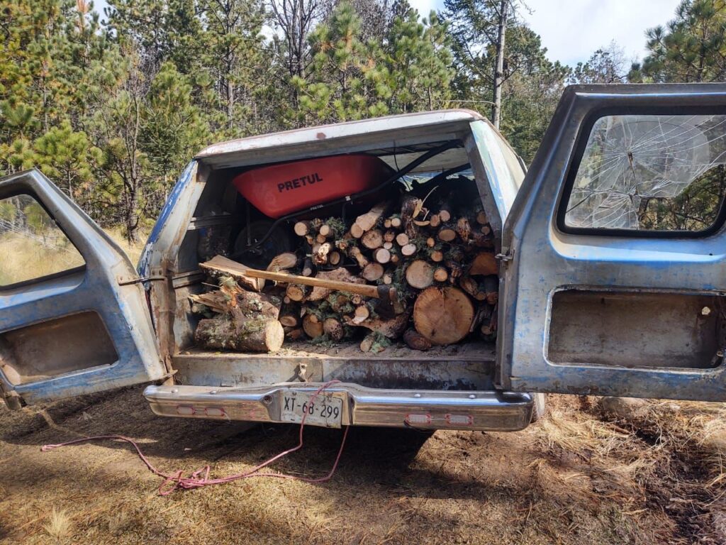 Esta acción permitió el aseguramiento de dos hachas, una motosierra Stihl, una camioneta de redilas, placas XW49810, y un vehículo Ford, placas XT68299.