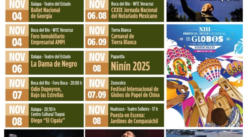 En las festividades regionales destacan el Carnaval de Tierra Blanca, del 06 al 09 de noviembre y el colorido Festival Internacional de Globos de Papel de China en Zozocolco, del 07 al 09. En Papantla continúa el Festival Ninín 2025, que celebra las tradiciones totonacas en torno al Día de Muertos.