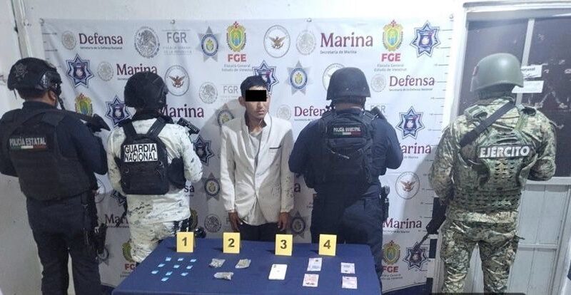 Como parte del apoyo a cateos realizados por la Fiscalía General del Estado, fue detenida una persona y se decomisaron nueve dosis y una bolsita de presunto cristal, 16 dosis de hierba seca con características similares a la marihuana, pipas de cristal, pasamontañas, camisolas tipo militar, gorras y una tabla de castigo.