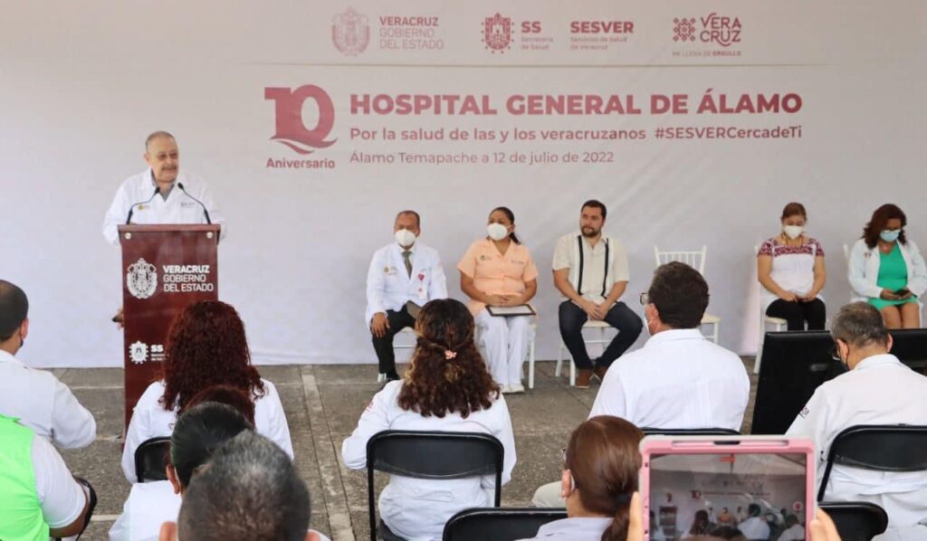 Álamo Temapache, Ver.- El Secretario de Salud y Director General de Servicios de Salud de Veracruz, Dr. Gerardo Díaz Morales, encabezó la ceremonia conmemorativa del décimo aniversario del Hospital General de Álamo, en donde además de reconocer la labor del personal hospitalario, refrendó el compromiso del gobierno del Estado para continuar con el fortalecimiento de la estructura y atención médica en beneficio de las familias veracruzanas.
