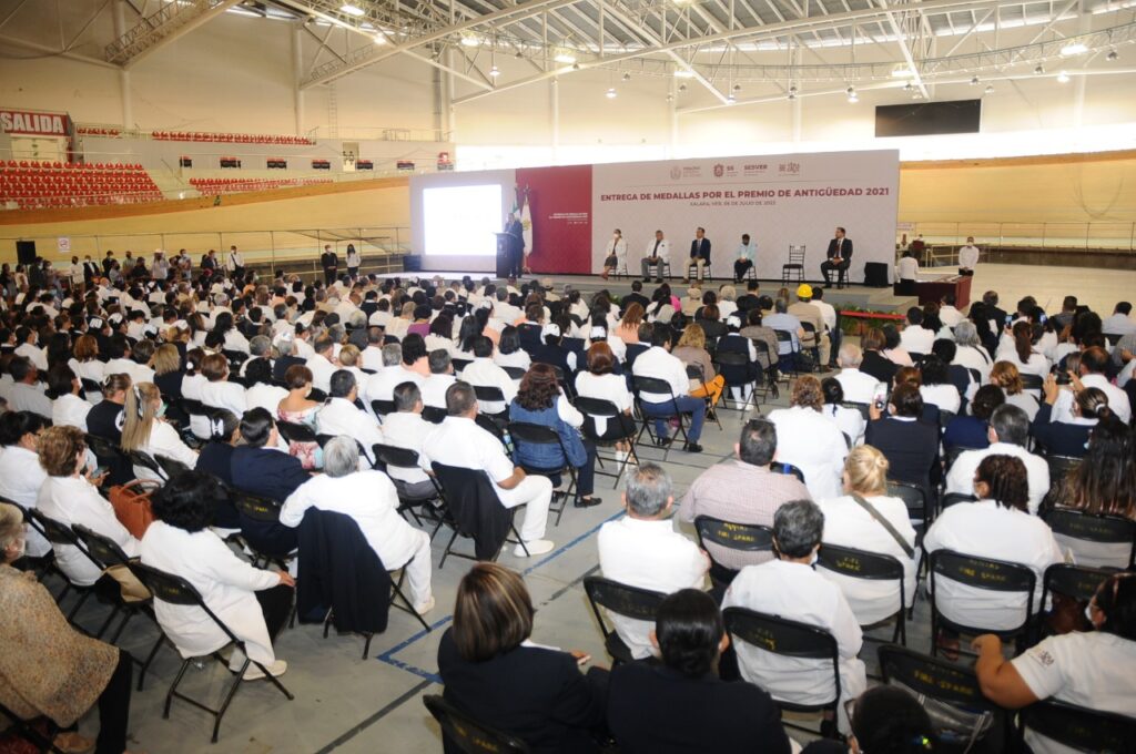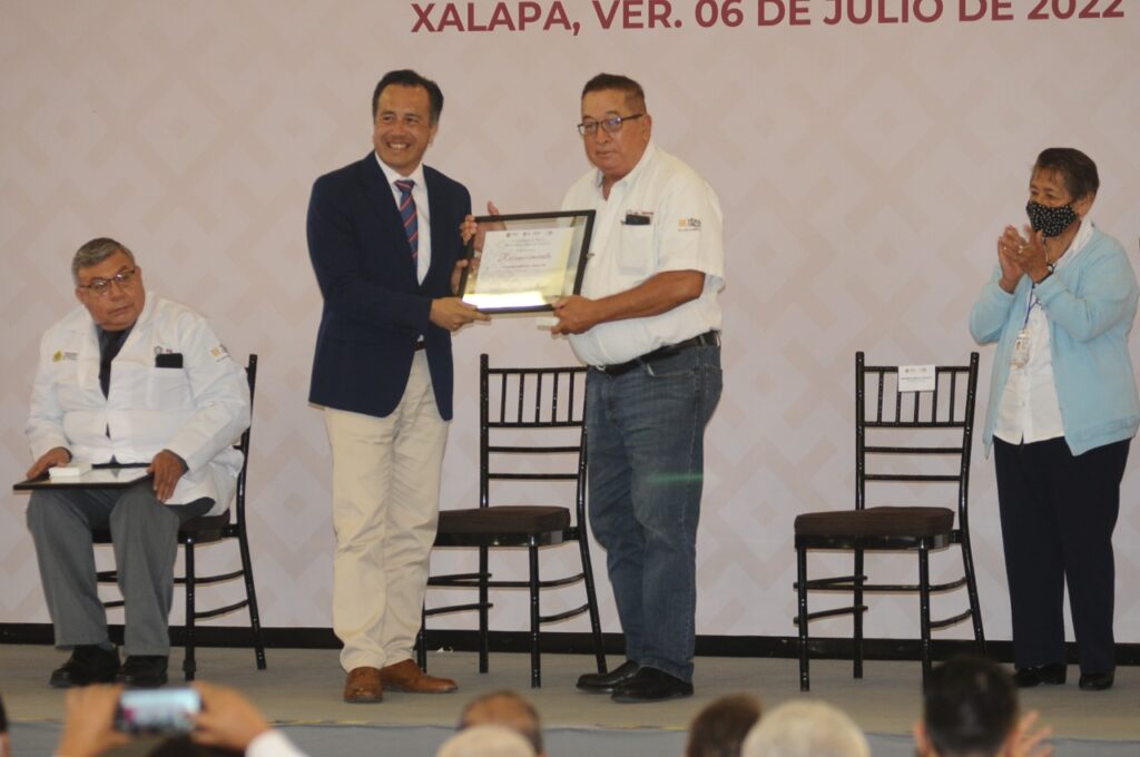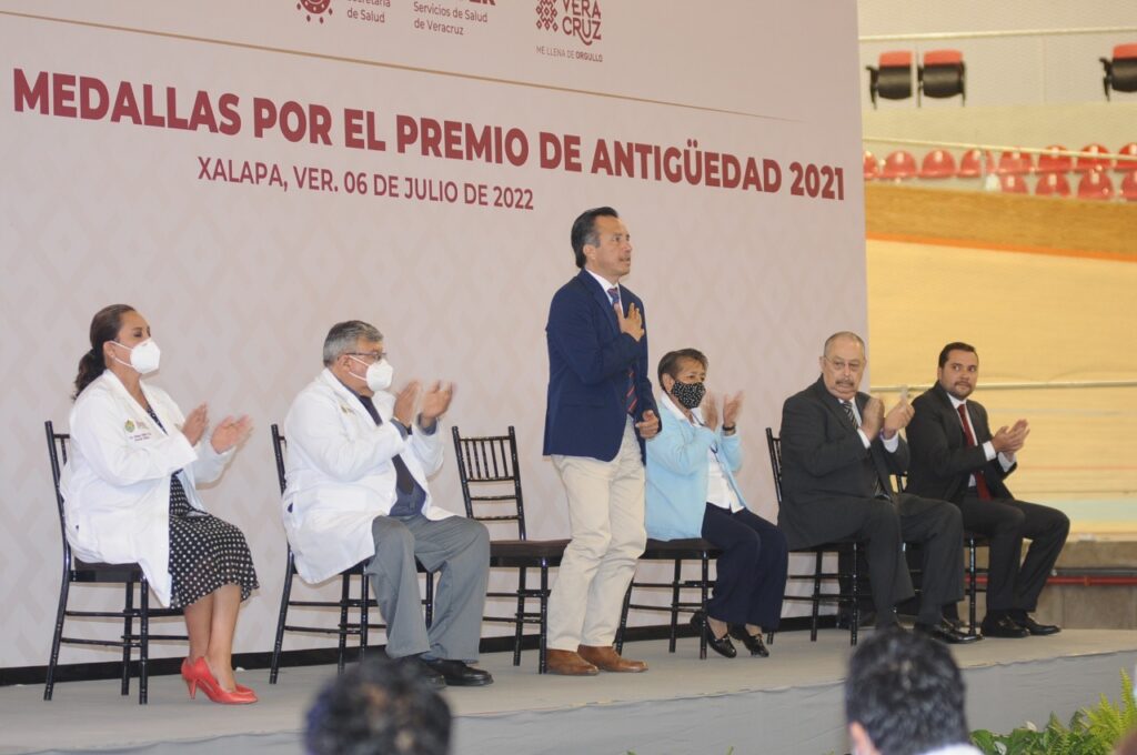 Desde el Velódromo Internacional de Xalapa, que durante la contingencia sanitaria funcionó como Centro de Atención Médica Expandida COVID-19, el mandatario y el titular de la dependencia, Gerardo Díaz Morales, entregaron el Premio de Antigüedad 2021 consistente en medalla y diploma a personal de diversas áreas.