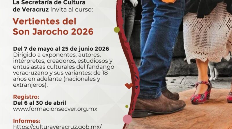 Xalapa, Ver., viernes 10 de abril de 2026.- La Secretaría de Cultura de Veracruz (SECVER) invita a participar en el Diplomado en Gestión Cultural 2026 y el curso Vertientes del Son Jarocho 2026, que se impartirán a través de la Plataforma Digital de Formación SECVER. Ambos programas requieren inscripción previa.