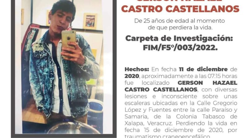 Gerson Hazael Castro Castellanos, fue localizado inconsciente, con diversos golpes por todo el cuerpo en unas escalinatas ubicadas en la calle Gregorio López y Fuentes entre las calles Paraíso y Samaria de la colonia Tabasco de Xalapa y falleció cuatro días después a consecuencia de un traumatismo craneoencefálico.
