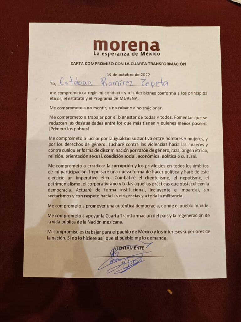 Firma Esteban Ramírez Zepeta carta compromiso para mantener los principios de Morena