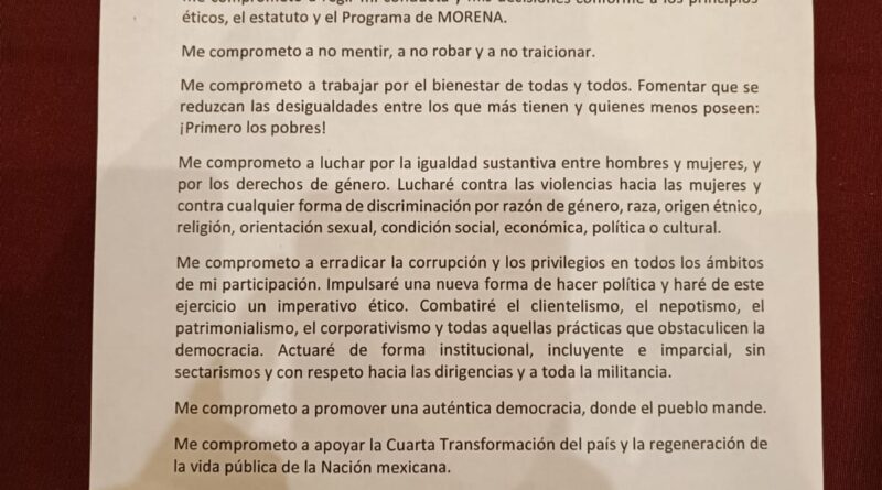 “Me comprometo a regir mi conducta y mis decisiones conforme a los principios éticos, el estatuto y el Programa de MORENA.