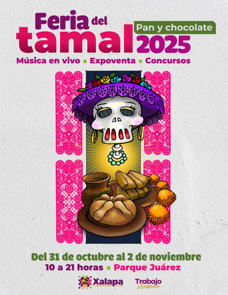Xalapa, Ver.- Con la participación de 50 expositores de Xalapa y la región, del 31 de octubre al 2 de noviembre, se llevará a cabo en el parque Benito Juárez la Feria del Tamal, Pan y Chocolate Xalapa 2025, evento con el que el Ayuntamiento fomenta el desarrollo económico y fortalece el turismo gastronómico.