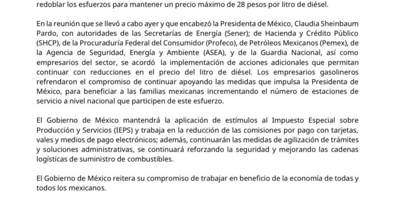 En la reunión que se llevó a cabo ayer y que encabezó la Presidenta de México, Claudia Sheinbaum Pardo, con autoridades de las Secretarías de Energía (Sener); de Hacienda y Crédito Público (SHCP), de la Procuraduría Federal del Consumidor (Profeco), de Petróleos Mexicanos (Pemex), de la Agencia de Seguridad, Energía y Ambiente (ASEA), y de la Guardia Nacional, así como empresarios del sector, se acordó la implementación de acciones adicionales que permitan continuar con reducciones en el precio del litro de diésel. Los empresarios gasolineros refrendaron el compromiso de continuar apoyando las medidas que impulsa la Presidenta de México, para beneficiar a las familias mexicanas incrementando el número de estaciones de servicio a nivel nacional que participen de este esfuerzo.
