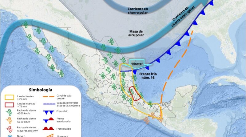 Por otro lado, en su aviso No. 658, de las 18:00 horas, el Servicio Meteorológico Nacional advirtió que el día de mañana el Frente Frío 16 será reforzado por una masa de aire polar.
