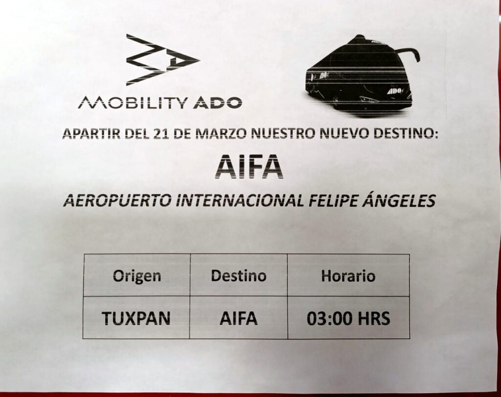 El costo es de 530 pesos y tiene tres escalas, una es en Poza Rica, otra en Villas de Pachuca para llegar al destino final el AIFA. El tiempo de recorrido desde esta ciudad porteña es a las 3:00 horas para llegar a las 7:20 am.