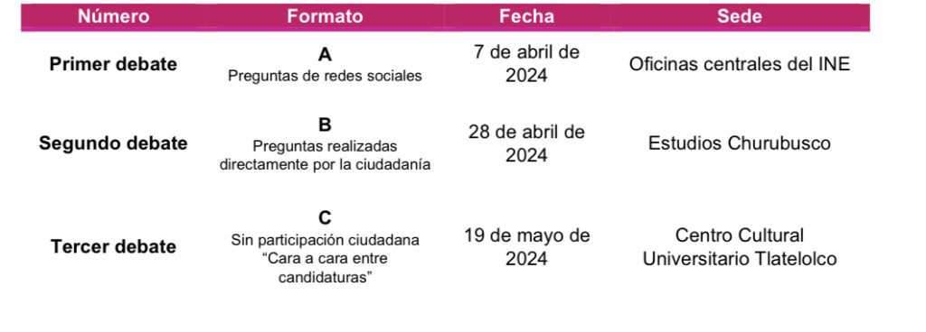 La Comisión Temporal de Debates del Instituto Nacional Electoral (INE) aprobó por unanimidad -en lo general- someter a consideración del pleno del Consejo General el formato y las sedes de cada uno de los debates entre las candidaturas a la Presidencia de la República en el Proceso Electoral Federal 2023-2024, en los siguientes términos: