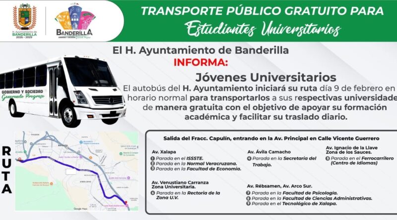 Con el propósito de impulsar la educación y apoyar la economía familiar, el gobierno municipal de Banderilla que preside José Antonio Sangabriel Fernández informó a la comunidad estudiantil que pone a su disposición un servicio de transporte universitario gratuito, a partir del lunes 9 de febrero, como una acción de gobierno implementada para apoyar con el traslado diario a la población escolar a sus respectivos centros de estudios.