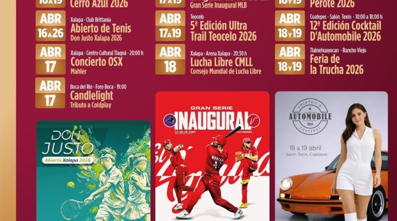 Asimismo, del 17 al 19 de abril, en Jalacingo, tendrá lugar el Carnaval de Jalacingo 2026, y en el estadio Beto Ávila, en Boca del Río, El Águila de Veracruz disputará la Gran Serie Inaugural de la MLB.