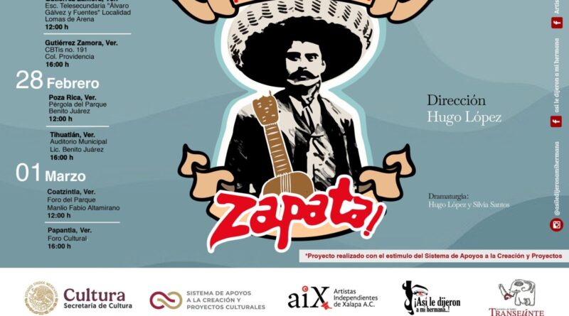 Xalapa, Ver., lunes 23 de febrero de 2026.- La Secretaría de Cultura de Veracruz invita a las funciones gratuitas de la puesta en escena ¡Por mi general Zapata!, presentada por la compañía de teatro independiente ¡Así le dijeron a mi hermana…!, del 26 de febrero al 01 de marzo.