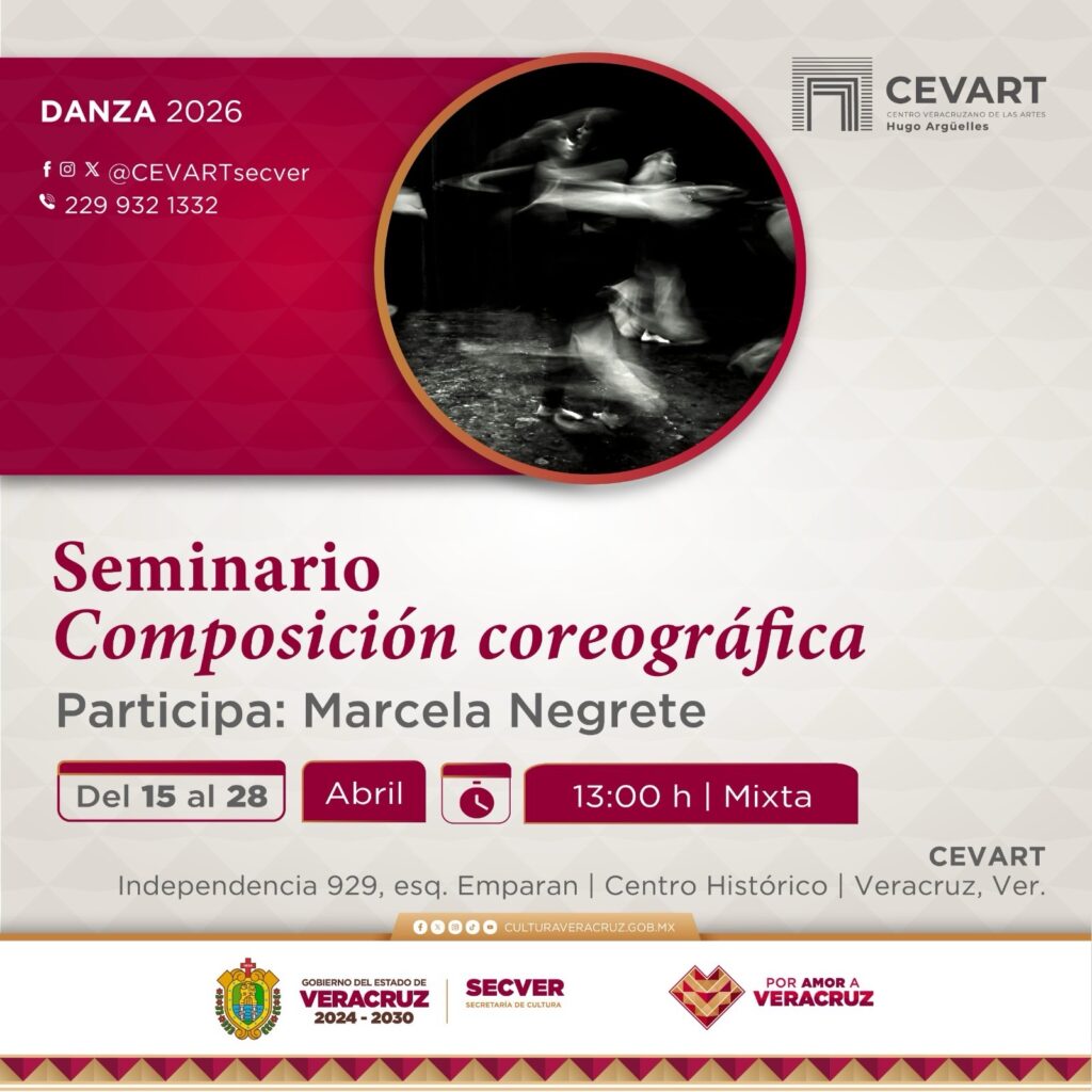 Xalapa, Ver., martes 07 de abril de 2026.- La Secretaría de Cultura de Veracruz (SECVER) invita a la serie de laboratorios creativos y seminarios en torno a la danza, que se llevarán a cabo en el Centro Veracruzano de las Artes Hugo Argüelles (CEVART), en la ciudad de Veracruz, en el marco del Día Internacional de la Danza. La entrada es libre.