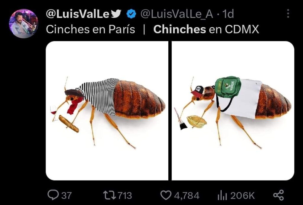 Ciudad de México. – “Chinches por aquí, chinches por allá”, en marco de la presencia de una plaga de este insecto en París y los reportes de su llegada al Metro, la UNAM y otros lugares de la Ciudad de México, las redes sociales fueron invadidas por memes.