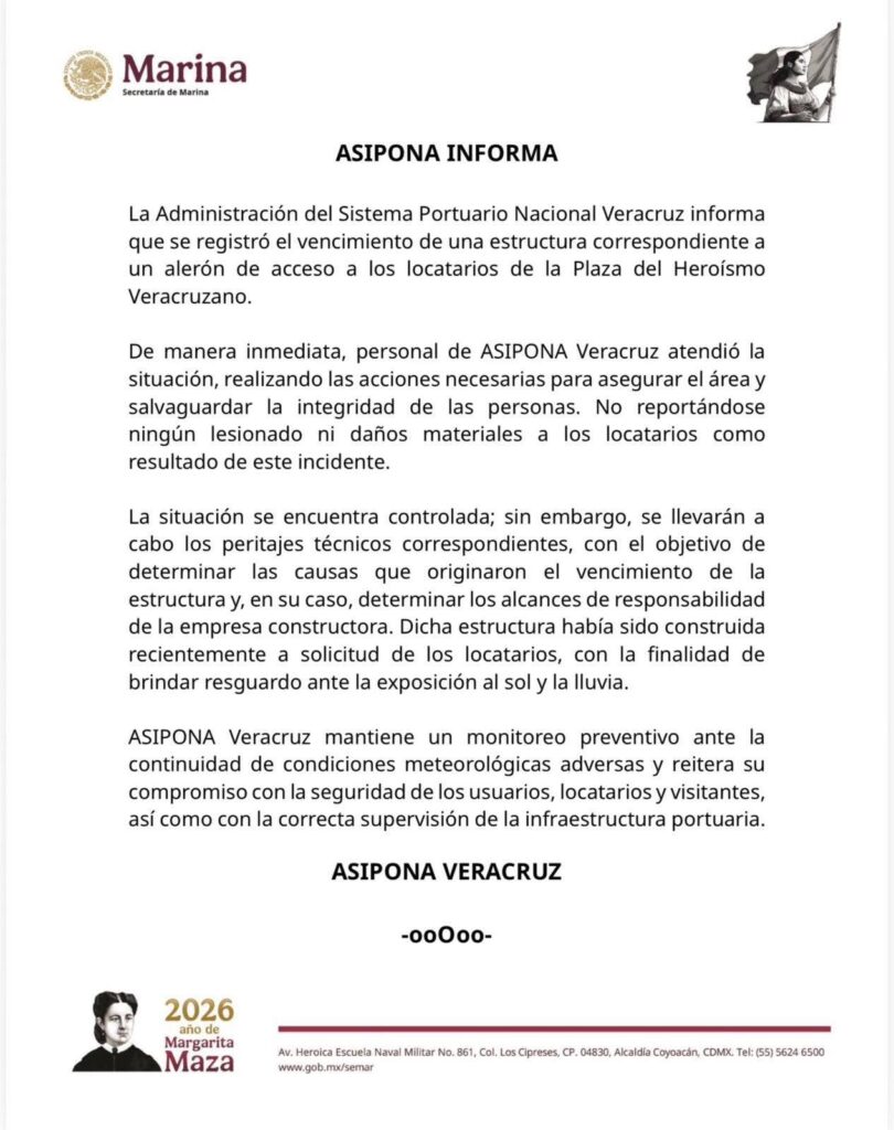 La Administración del Sistema Portuario Nacional Veracruz informa que se registró el vencimiento de una estructura correspondiente a un alerón de acceso a los locatarios de la Plaza del Heroísmo Veracruzano.