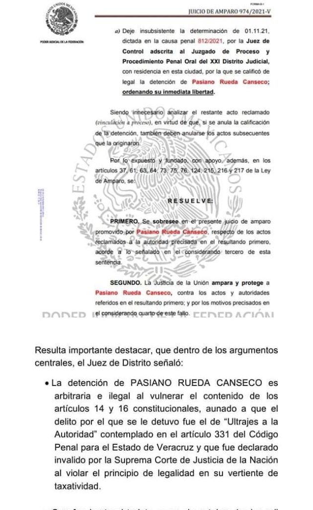 Xalapa, Ver.- Desde el día treinta de junio del año dos mil veintidós, fue dictada sentencia en el Juicio de Amparo Indirecto 974/2021 del índice del Juzgado Noveno de Distrito con residencia en Coatzacoalcos, promovido por Pasiano Rueda Canseco, en donde se determinó que la Justicia de la Unión Ampara y Protege a PASIANO RUEDA CANSECO y ordena dejar insubsistente la determinación de primero de noviembre de dos mil veintiuno, por medio de la cual la Juez de Control adscrita al Juzgado de Proceso y Procedimiento Penal Oral del XXI Distrito Judicial calificó de legal la detención ordenando su inmediata libertad.