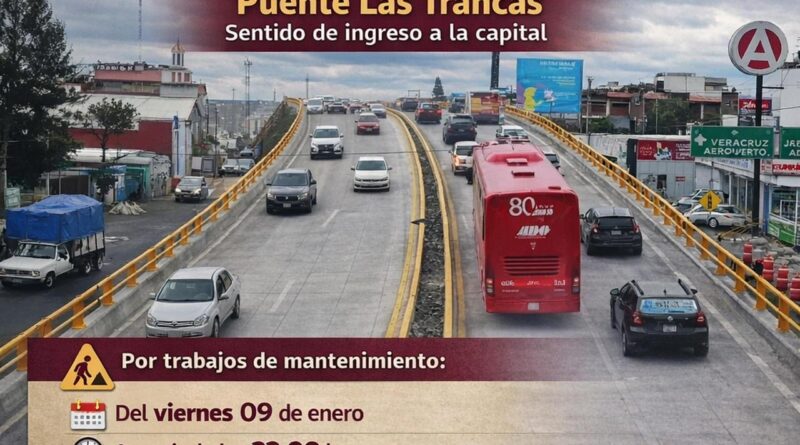 Xalapa, Ver., jueves 08 de enero de 2026.– La Secretaría de Infraestructura y Obras Públicas (SIOP) informa que, debido a trabajos de mantenimiento, se realizará el cierre del puente Las Trancas en el sentido de ingreso a la ciudad de Xalapa, a partir de las 22:00 horas de este viernes y hasta la mañana del domingo 11 de enero.