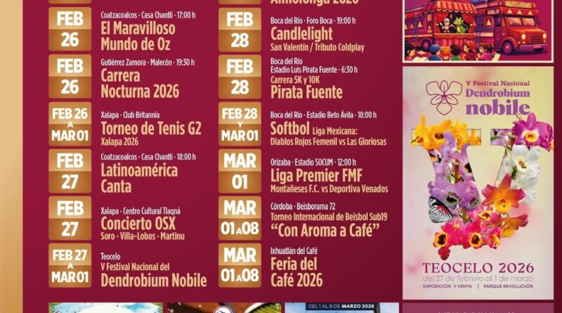 Del 27 de febrero al 01 de marzo, Teocelo será sede del V Festival Nacional del Dendrobium Nobile; y hasta el 02 de marzo, Almolonga celebrará su Carnaval 2026.