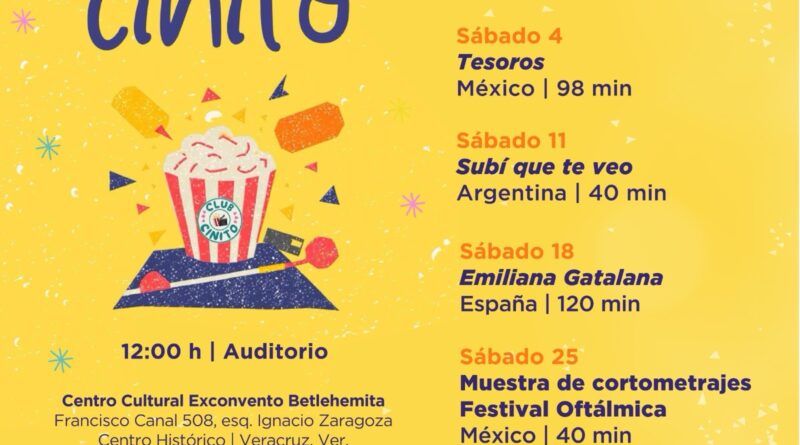 Xalapa, Ver., viernes 10 de abril de 2026.- La Secretaría de Cultura de Veracruz (SECVER), en colaboración con el Festival de Cine Infantil Oftálmica, invita a disfrutar del programa cinematográfico Club Cinito, que se realizarálos sábados de abril en el Centro Cultural ExconventoBetlehemita, en Veracruz, en el marco del Día de las Infancias.