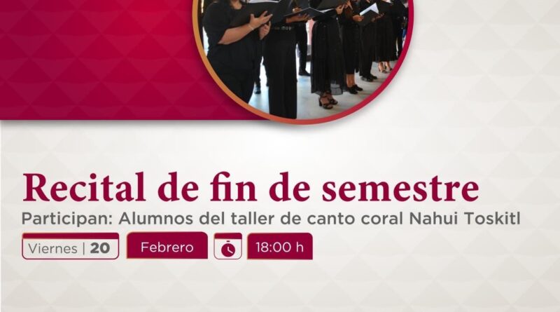 Xalapa, Ver., jueves 19 de febrero de 2026.- La Secretaría de Cultura de Veracruz (SECVER) invita al público a asistir al recital de fin de semestre del Taller de Canto Coral Nahui Toskitl, que se llevará a cabo este viernes 20 de febrero, a las 18:00 horas, en el Centro Cultural Atarazanas. La actividad es gratuita.