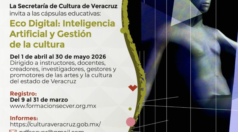 Xalapa, Ver., miércoles 11 de marzo de 2026.- La Secretaría de Cultura de Veracruz (SECVER) invita al público a participar en la serie de cápsulas educativas Eco Digital: Inteligencia Artificial y Gestión de la Cultura 2026, que se transmitirá del 07 de abril al 30 de mayo a través de la Plataforma Digital de Formación SECVER, disponible en el portal https://www.formacionsecver.org.mx/.