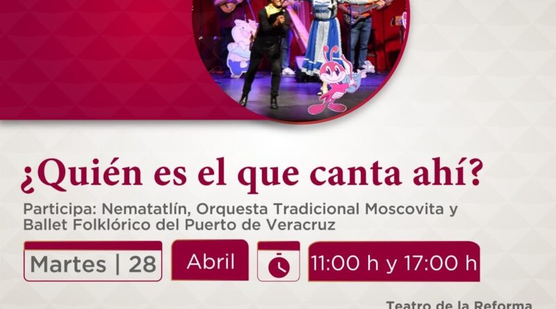 Xalapa, Ver., sábado 25 de abril de 2026.- La Secretaría de Cultura de Veracruz, en colaboración con la Dirección General de Difusión Cultural de la Universidad Veracruzana (UV), invita a la presentación artística ¿Quién es el que canta ahí? el próximo martes 28 de abril, en funciones de 11:00 y 17:00 horas, en la Sala Principal del Teatro de la Reforma, en el puerto de Veracruz. La entrada es gratuita.
