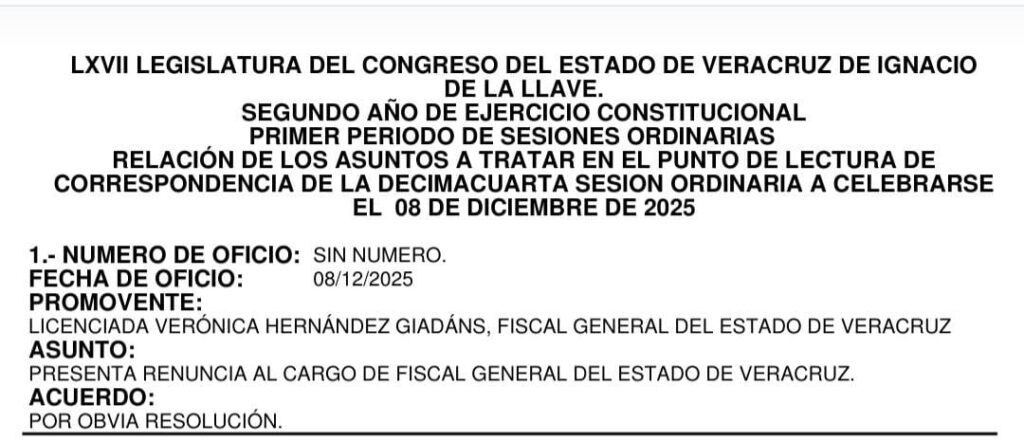 El Congreso de Veracruz recibió la renuncia de Verónica Hernández Giadáns al cargo como Fiscal General del Estado.