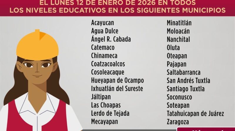 Xalapa, Ver., domingo 11 de enero de 2026.– El Comité Estatal de Emergencias, en coordinación con la Secretaría de Educación de Veracruz, determinó la suspensión de clases el lunes 12 de enero, en todos los niveles educativos, ante el pronóstico de lluvias significativas derivadas del Frente Frío 27, en 26 municipios del sur del estado.