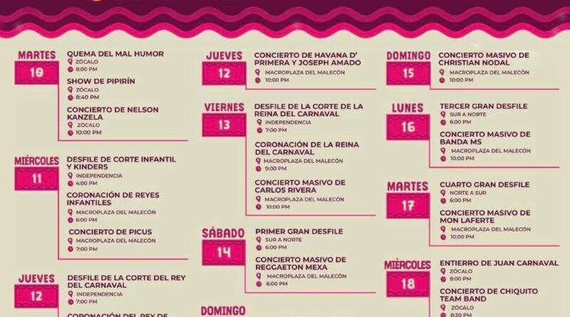 El sábado 14 se realizará el Primer Gran Desfile y el concierto de Reggaetón Mexa. El domingo 15 continuará el Segundo Gran Desfile y la presentación de Christian Nodal.