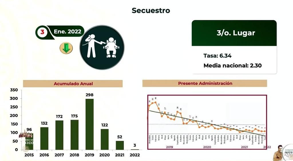 Destaca solo tres secuestros en 2022, en contraste con el año 2019 cuando se registraron 298
