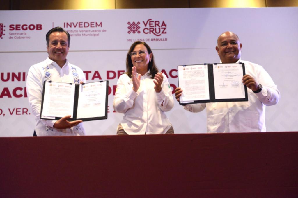 En este marco el Gobierno de Veracruz firmó el Convenio Macro de Colaboración del Instituto Veracruzano de Desarrollo Municipal (INVEDEM) con los munícipes María Esther López Callejas, Actopan; Raymundo Andrade Rivera, Coatepec; Mariela Hernández García, Las Choapas; Óscar Guzmán de Paz, Pánuco, y Eric Domínguez Vázquez, Papantla, para implementar políticas públicas que impulse el desarrollo de estos.