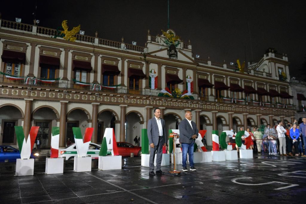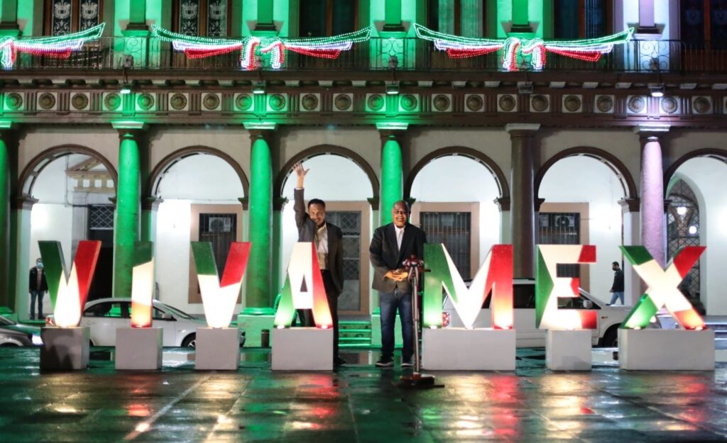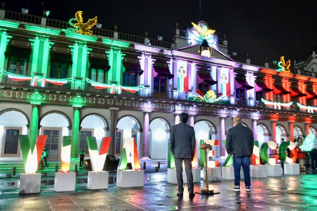 Como cada año, el Gobierno del Estado colocó figuras conmemorativas, que incluyen luces tricolores, campanas y las macro letras “¡VIVA MÉXICO!” colocadas en la plancha de la plaza Lerdo.